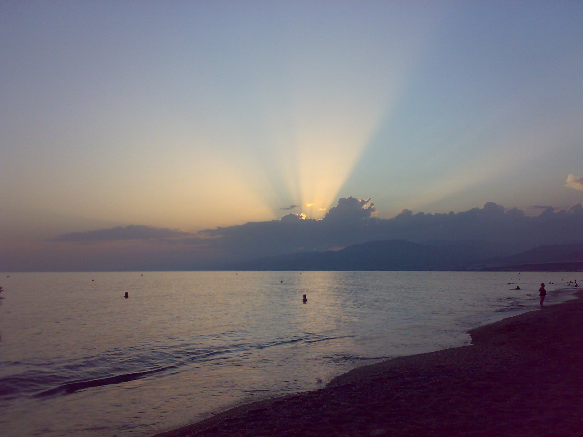 Por Lorenzo Hernández • 25 Ago, 2009 • Sección: Hablar de CienciaEste verano, en el pueblo donde veraneo, Balerma (Almería), pude observar el fenómeno de los rayos crepusculares. En el atardecer de la foto, vemos algunos haces de luz que se cuelan entre las nubes y se muestran como verdaderos chorros de luz, que parecieran estar formados por infinitud de hilos luminosos. El efecto se debe a la difusión de la luz combinada por zonas nebulosas o relieves que actúan como mascaras. Como en otros efectos luminosos de la atmósfera, la difusión juega un papel importante y aumenta el efecto visual al permitir mostrar mejor las zonas luminosas frente a aquellas que están en sombra. Las mascaras crean las zonas oscuras que a su vez aumentan el contraste de las que quedan iluminadas.