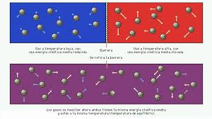 Por ejemplo, podemos considerar un sistema ordenado el que forman un cuerpo caliente junto a otro frío. Microscópicamente, podemos considerar que las partículas que tienen mayor energía cinética están en el cuerpo de mayor temperatura, y al otro las que tienen menor energía cinética. Debido a esta diferencia de temperatura podemos obtener un trabajo cuando se produce una transferencia de energía térmica de un cuerpo a otro. A esta transferencia de energía térmica entre cuerpos de distinta temperatura es lo que denominamos calor. Microscópicamente veríamos partículas con mayor velocidad chocando con partículas de menor velocidad hasta que al final todas alcanzarían la misma velocidad, y ambos cuerpos alcanzarían la misma temperatura. Este sistema resultante está más desordenado que el anterior y ha alcanzado el equilibrio término. Esto hace que no podamos obtener más provecho energético de dicho sistema.